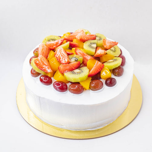 Strawberry shortcake topped with kiwi, peaches, grapes, and strawberries
